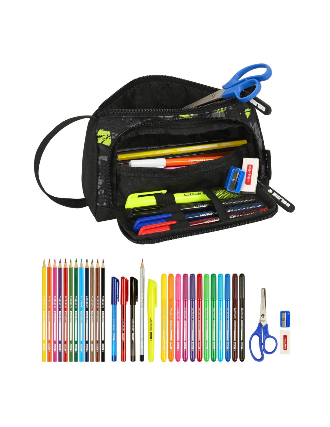 Trousse Scolaire avec Accessoires Kelme Jungle Noir Gris Citron 20 x 11 x 8.5 cm (32 Pièces) et d’autres