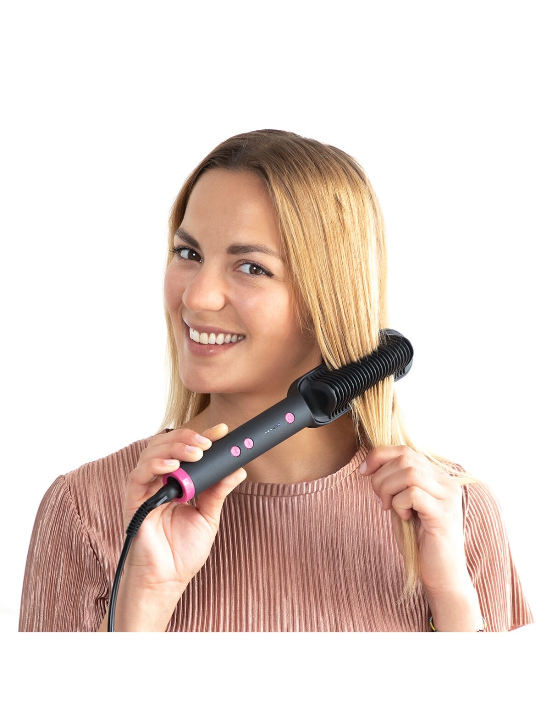 - 5 niveaux de température : Cette brosse céramique lissante dispose d’un bouton on/off et de boutons +/- pour sélectionner ses 5 niveaux de température avec indicateurs LED : 130-150-160-170-180 ºC. Cela vous permet de choisir la température qui convient le mieux à votre type de cheveux et au lissage souhaité.
