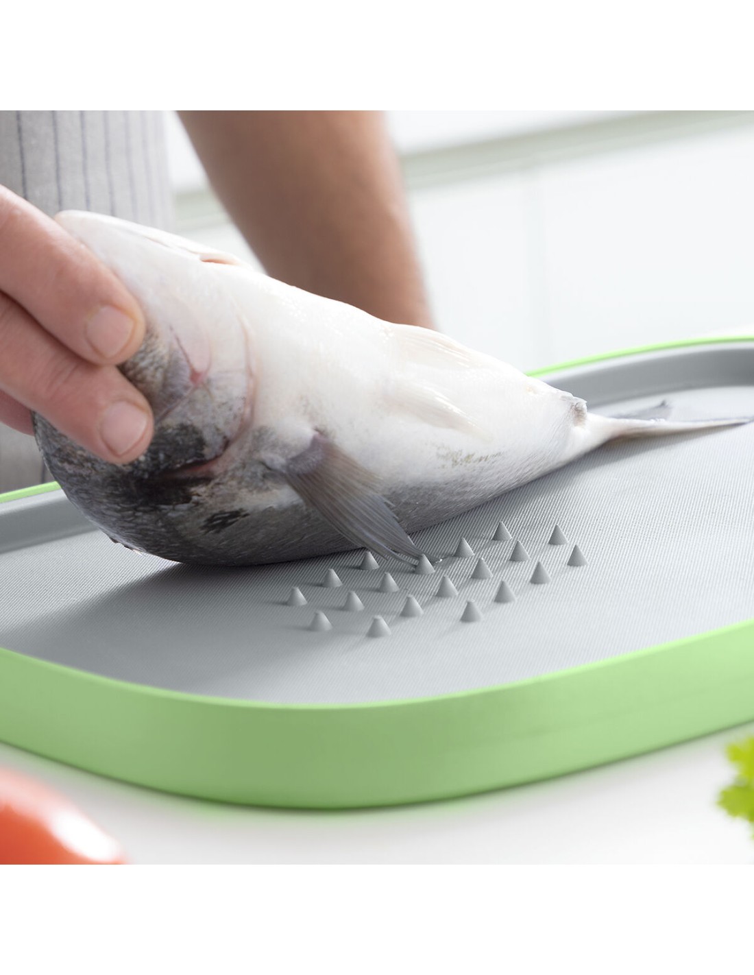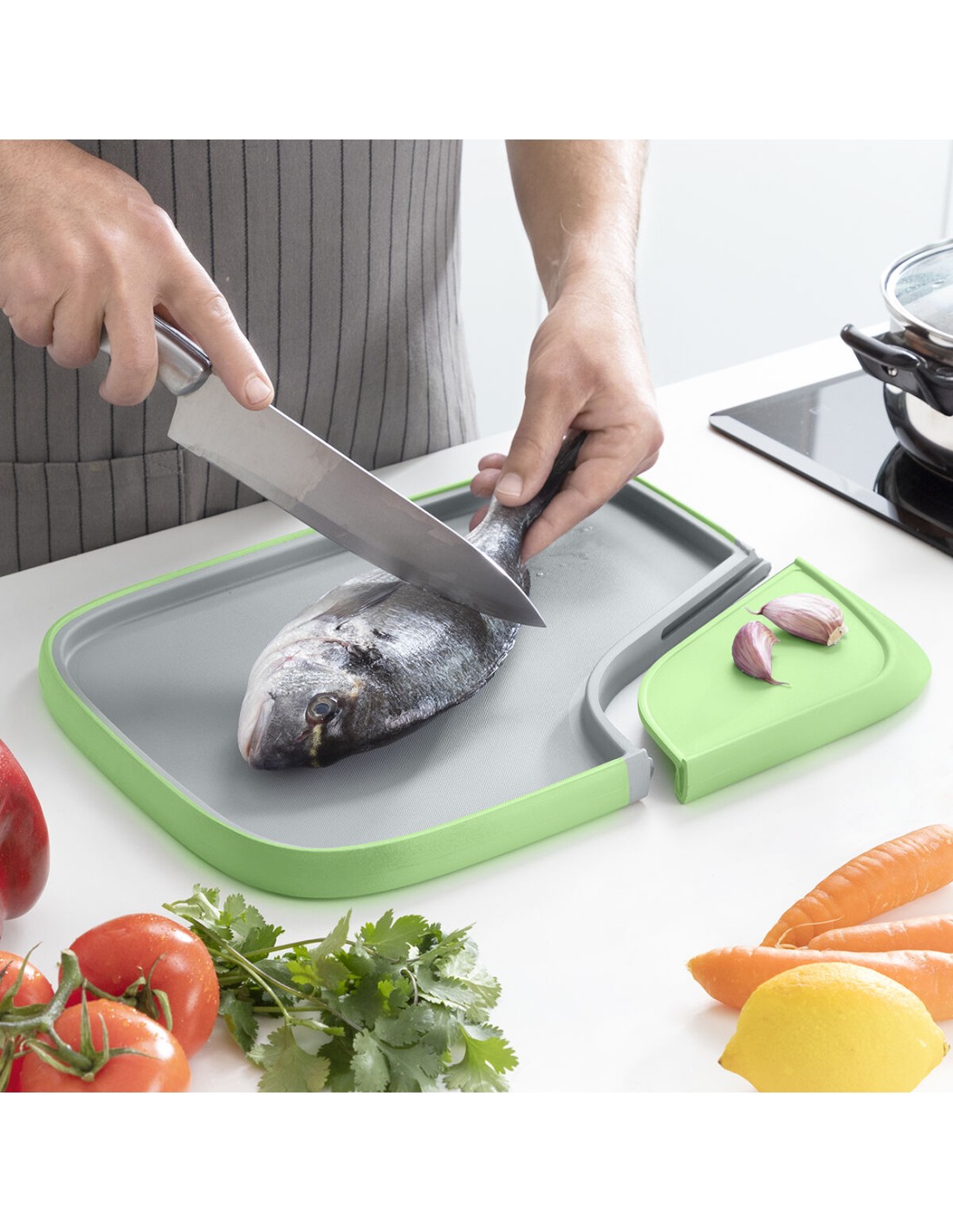 Une planche à découper originale et polyvalente qui ne peut manquer dans les cuisines les plus modernes grâce à son design multifonctionnel et multi-positions, car elle offre de multiples possibilités pour faciliter les tâches pendant la préparation des aliments. Elle permet de couper facilement, car elle est antidérapante et possède des points de fixation centraux pour que les aliments ne glissent pas. De plus, elle est divisible : l'une des extrémités sert de râpe et peut être retirée/détachée de la planche, ce qui la rend très utile pour déposer les aliments coupés ou râpés et les verser plus facilement dans la casserole ou la poêle. Cette planche à découper est également réversible, car elle peut être utilisée des deux côtés en fonction de l'utilisation et des besoins. Le bord surélevé empêche les débordements, ce qui en fait un outil parfait pour décongeler les aliments sans répandre de l'eau sur le plan de travail. Elle permet de gagner de la place dans la cuisine et elle est robuste, compacte et légère. Facile à nettoyer, va au lave-vaisselle.